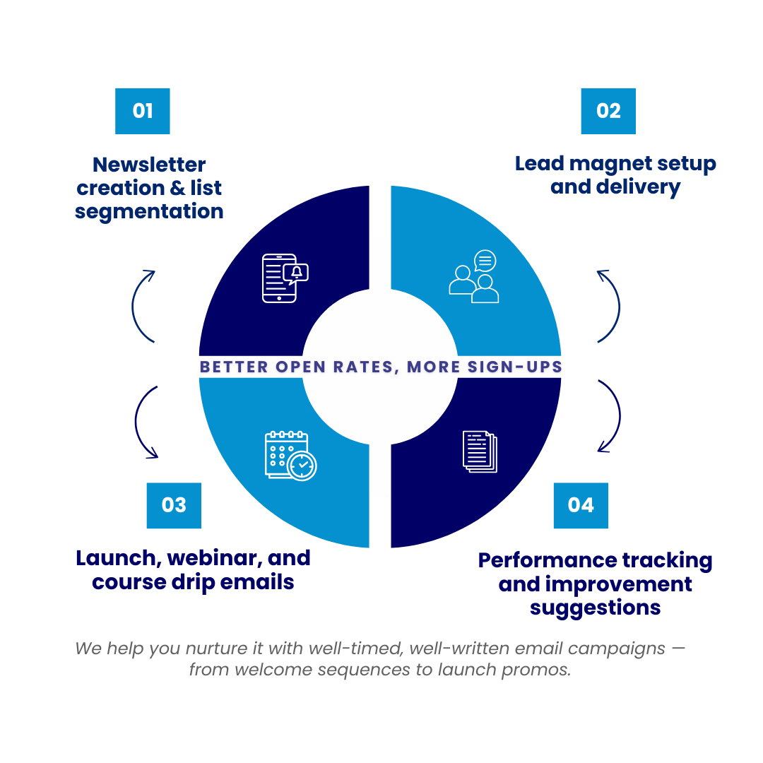 Your email list is one of your most valuable assets. We help you nurture it with well-timed, well-written email campaigns — from welcome sequences to launch promos.