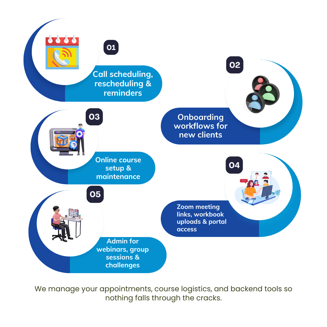 From discovery calls to live workshops, your calendar is your lifeline. We manage your appointments, course logistics, and backend tools so nothing falls through the cracks.