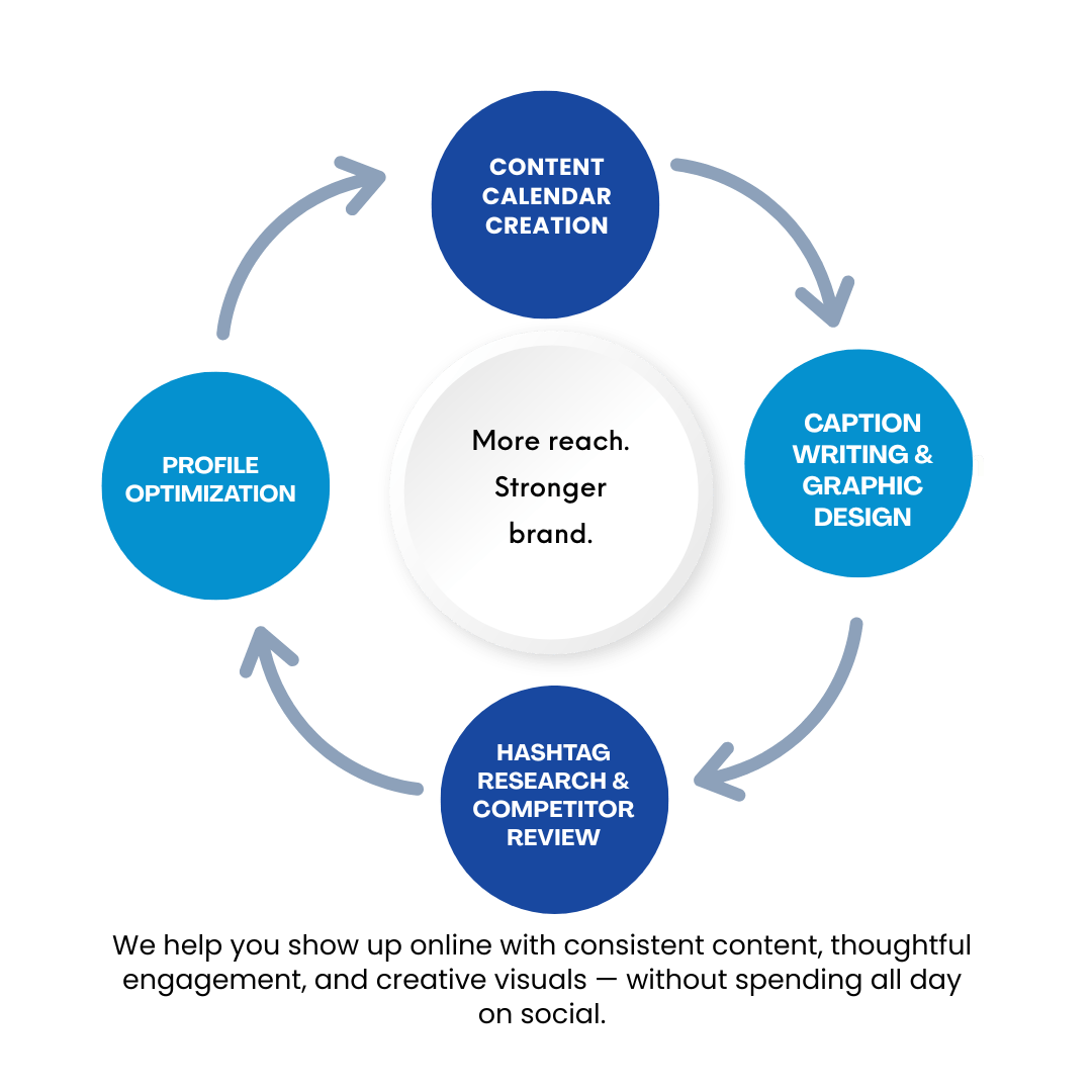 We help you show up online with consistent content, thoughtful engagement, and creative visuals — without spending all day on social.